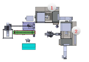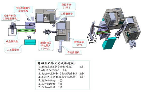 1.人工將軸承套圈毛坯件批量倒入毛坯料倉(自動(dòng)提升機(jī))→自動(dòng)提升機(jī)將毛坯件通過滑道送至自動(dòng)翻面及定位機(jī)構(gòu)→六軸機(jī)器人從定位機(jī)構(gòu)抓取毛坯件→機(jī)器人將毛坯件送至1號(hào)機(jī)床→機(jī)器人取出1號(hào)機(jī)床加工完成的工件→機(jī)器人將毛坯件裝入1號(hào)機(jī)床→六軸機(jī)器人將1號(hào)機(jī)床取出的工件送至工件翻轉(zhuǎn)臺(tái)→翻轉(zhuǎn)臺(tái)將工件翻轉(zhuǎn)→六軸機(jī)器人從翻轉(zhuǎn)臺(tái)抓取工件送至2號(hào)機(jī)床→機(jī)器人取出2號(hào)機(jī)床加工完成的工件→六軸機(jī)器人把從翻轉(zhuǎn)臺(tái)的工件裝入2號(hào)機(jī)床→六軸機(jī)器人把成品件送至成品件料倉→機(jī)器人回至毛坯件抓取下一個(gè)毛坯件,如此循環(huán)。