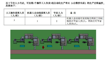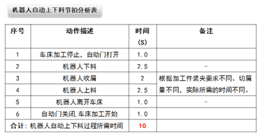 機(jī)器人自動(dòng)上下料過程所需時(shí)間為10秒,車床加工節(jié)拍為50秒,合計(jì)完成一個(gè)工件的加工時(shí)間為60秒,每天工作時(shí)間按20小時(shí)計(jì)算(2個(gè)班組),則每組自動(dòng)化生產(chǎn)單元每天的產(chǎn)量約為1200個(gè)。