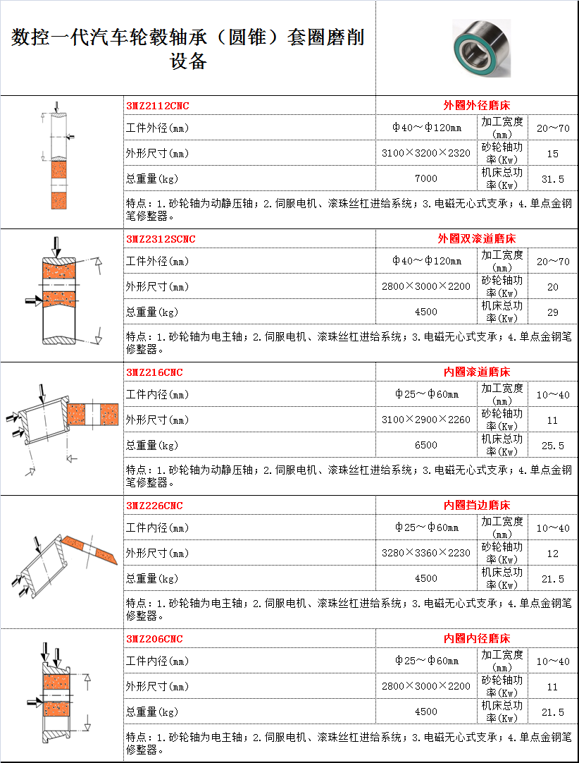 用途:磨削一代汽車輪轂軸承的套圈(圓錐) 特點: 1.砂輪軸為動靜壓軸; 2.伺服電機、滾珠絲杠進給系統(tǒng); 3.電磁無心式支承; 4.單點金鋼筆凸度修整器。